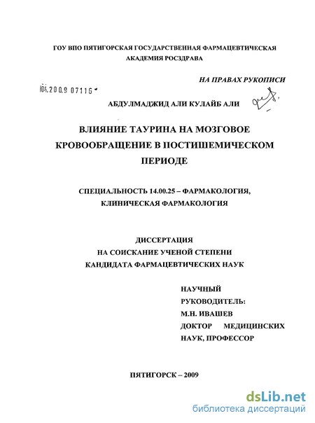 Изучение влияния лекарственного вещества таурина и лекарственного препарата таурина на сопротивление сосудов мозга в постишемическом периоде