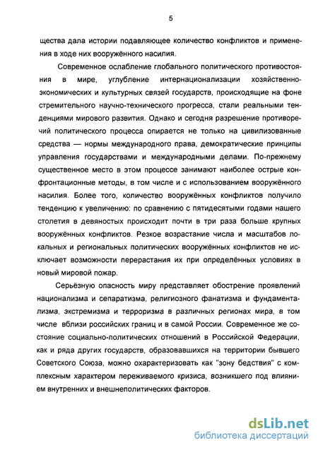 Современное ослабление глобального политического противостояния в мире, углубление интернационализации хозяйственно-экономических и культурных связей государств, происходящие на фоне стремительного научно-технического прогресса, стали реальными тенденциями мирового развития. Однако и сегодня разрешение противоречий политического процесса опирается не только на цивилизованные средства — нормы международного права, демократические принципы управления государствами и международными делами. По-прежнему существенное место в этом процессе занимают наиболее острые кон-фронтационные методы, в том числе и с использованием вооружённого насилия. Более того, количество вооружённых конфликтов получило тенденцию к увеличению: по сравнению с пятидесятыми годами нашего столетия в девяностых происходит почти в три раза больше крупных вооружённых конфликтов. Резкое возрастание числа и масштабов локальных и региональных политических вооружённых конфликтов не исключает возможности перерастания их при определённых условиях в новый мировой пожар.
