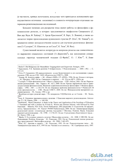 Большое значение для раскрытия темы имеют работы по философии и феноменологии религии, в которых прослеживается морфология Священного (Г. Ван дер Леув, Ф. Хайлер, У. Бреде Кристенсен, К. Барт, Э. Леманн), а также излагаются теории происхождения нуминозного чувства (Р. Отто, М. Элиаде), открываются новые методологические аспекты для изучения религиозных феноменов (Э. Гуссерль, П. Шантепи де ла Соссе, К. Тиле, И. Вах).