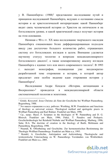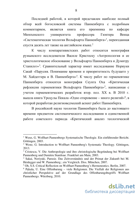 В российской науке теология Панненберга была до настоящего времени предметом систематического исследования в единственной работе советского периода «Критический анализ теологической концепции В. Панненберга» Рыбниковой Г.И.8 Автор диссертации рассматривала свой труд в качестве «марксистской критики модернизированных форм религи-