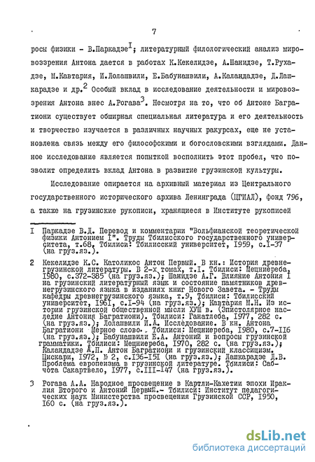 4 Прангишвили А.С. Очерки по истории психологических знаний в Грузии (ХУП-ХУШ вв. и начало XIX в.). Тбилиси: АН ГССР, 1959, с.194-357 (на груз.яз.). росы физики - В.Паркадзе ; литературный филологический анализ мировоззрения Антона дается в работах К.Кекелидзе, А.Шанидзе, Т.Руха- дзе, М.Кавтария, И.Лолашвили, Е.Бабунашвили, А.Каландадзе, Д.Лаш- карадзе и др. Особый вклад в исследование деятельности и мировоз- зрения Антона внес А.Рогава, . Несмотря на то, что об Антоне Багра-тиони существует обширная специальная литература и его деятельность и творчество изучается в различных научных ракурсах, еще не установлена связь между его философскими и богословскими взглядами. Данное исследование является попыткой восполнить этот пробел, что позволит определить вклад Антона в развитие грузинской культуры.