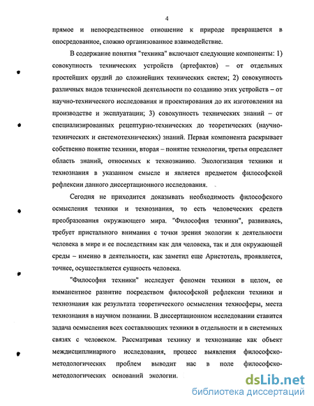 "Философия техники" исследует феномен техники в целом, ее имманентное развитие посредством философской рефлексии техники и технознания как результата теоретического осмысления техносферы, места технознания в научном познании. В диссертационном исследовании ставится задача осмысления всех составляющих техники в отдельности и в системных связях с человеком. Рассматривая технику и технознание как объект междисциплинарного исследования, процесс выявления философско-методологических проблем выводит нас в поле философско-методологических оснований экологии. В данном случае мы имеем пересечение методологических полей техники, технознания и экологии; кроме того, появляется возможность взаимопроникновения и обогащения знаний экологических и знаний технических и их философской рефлексии.