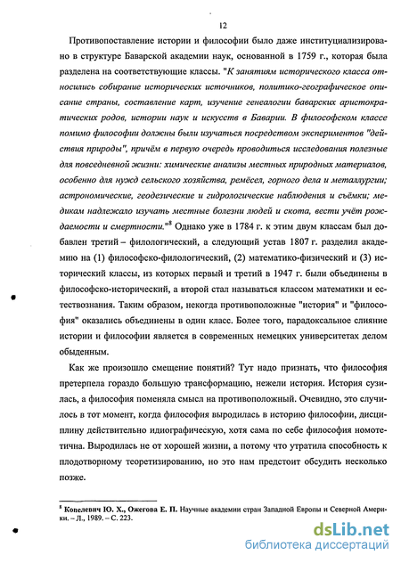 Противопоставление истории и философии было даже институциализирова-но в структуре Баварской академии наук, основанной в 1759 г., которая была разделена на соответствующие классы. "К занятиям исторического класса относились собирание исторических источников, политико-географическое описание страны, составление карт, изучение генеалогии баварских аристократических родов, истории наук и искусств в Баварии. В философском классе помимо философии должны были изучаться посредством экспериментов "действия природы", причём в первую очередь проводиться исследования полезные для повседневной жизни: химические анализы местных природных материалов, особенно для нужд сельского хозяйства, ремёсел, горного дела и металлургии; астрономические, геодезические и гидрологические наблюдения и съёмки; медикам надлежало изучать местные болезни людей и скота, вести учёт рождаемости и смертности." Однако уже в 1784 г. к этим двум классам был добавлен третий - филологический, а следующий устав 1807 г. разделил академию на (1) философско-филологический, (2) математико-физический и (3) исторический классы, из которых первый и третий в 1947 г. были объединены в философско-исторический, а второй стал называться классом математики и естествознания. Таким образом, некогда противоположные "история" и "философия" оказались объединены в один класс. Более того, парадоксальное слияние истории и философии является в современных немецких университетах делом обыденным.