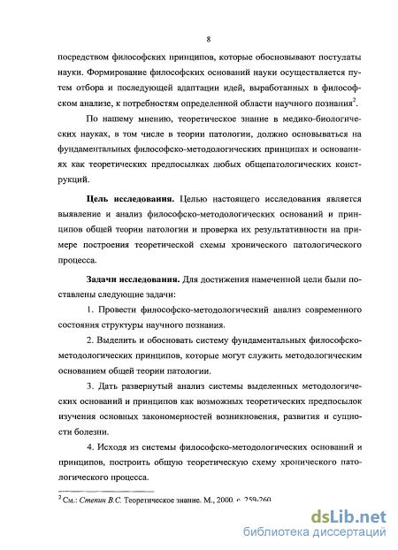 Цель исследования. Целью настоящего исследования является выявление и анализ философско-методологических оснований и принципов общей теории патологии и проверка их результативности на примере построения теоретической схемы хронического патологического процесса.