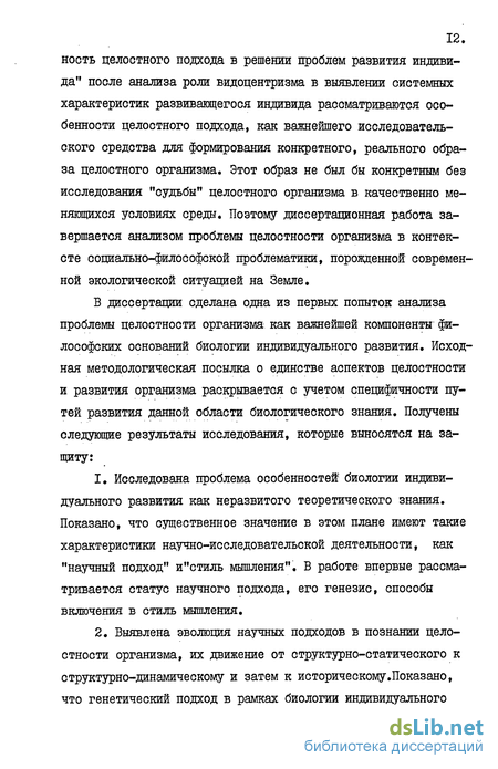 . ность целостного подхода в решении проблем развития индивида" после анализа роли видоцентризма в выявлении системных характеристик развивающегося индивида рассматриваются особенности целостного подхода, как важнейшего исследовательского средства для формирования конкретного, реального образа целостного организма. Этот образ не был бы конкретным без исследования "судьбы" целостного организма в качественно меняющихся условиях среды. Поэтому диссертационная работа завершается анализом проблемы целостности организма в контексте социально-философской проблематики, порожденной современной экологической ситуацией на Земле.