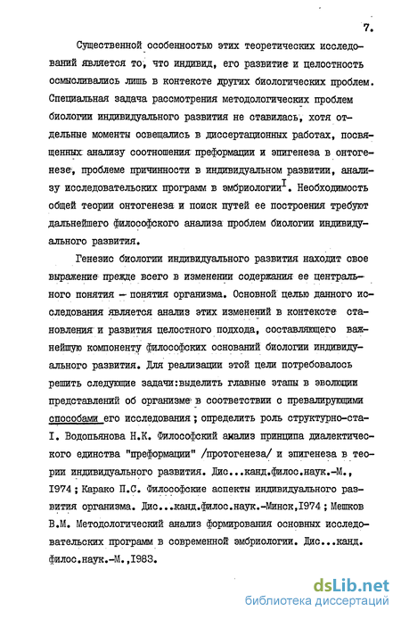 Существенной особенностью этих теоретических исследований является то, что индивид, его развитие и целостность осмысливались лишь в контексте других биологических проблем. Специальная задача рассмотрения методологических проблем биологии индивидуального развития не ставилась, хотя отдельные моменты освещались в диссертационных работах, посвященных: анализу соотношения; преформации и эпигенеза в онтогенезе, проблеме причинности в индивидуальном развитии, анализу исследовательских программ в эмбриологии . Необходимость общей теории онтогенеза и поиск путей ее построения требуют дальнейшего философского анализа проблем биологии индивидуального развития.