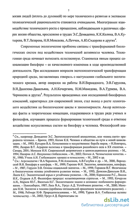 Современные экологические проблемы связаны с трансформацией биологических систем под воздействием технической активности человека. Техногенная среда начинает вытеснять есгественную. Становится явным процесс социализации биосферы - ее качественного изменения в ходе производственной деятельности. При исследовании вопросов экотехнологической трансформации природной среды, заставляющих говори і ь о наступлении глобального экологического кризиса, автор опирался на работы В.И.Вернадского, Э.В.Гирусова, В.И.Данилова-Данильяна, А.Н.Кочергина, Н.М.Мамедова, В.А.Тураева, В.А. Черникова и других5. Результатом проведенных ими исследований биосферных изменений, характерных для современной эпохи, стал вывод о росте техногенного воздействия на биологические циклы и закономерности. Авюр использовал факты и теоретические концепции, содержащиеся в трудах ряда ученых и философов, изучавших процессы формирования техногенной среды и ответное воздействие искусственных систем на биосферу и человека. Философский ана