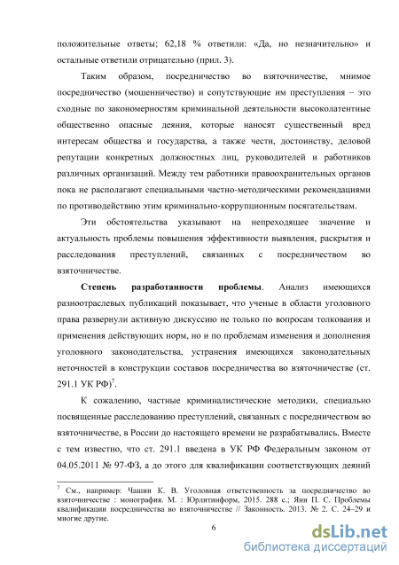 Степень разработанности проблемы. Анализ имеющихся разноотраслевых публикаций показывает, что ученые в области уголовного права развернули активную дискуссию не только по вопросам толкования и применения действующих норм, но и по проблемам изменения и дополнения уголовного законодательства, устранения имеющихся законодательных неточностей в конструкции составов посредничества во взяточничестве (ст. 291.1 УК РФ)8.
