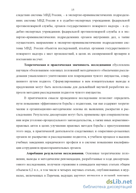 Научная новизна исследования. Диссертация представляет собой комплексное монографическое исследование наиболее важных и проблемных вопросов организации расследования умышленного уничтожения или повреждения чужого имущества, совершенного путем поджога, с позиций современной криминалистической теории и практики. В работе раскрыты особенности криминалистической характеристики поджогов с их изучением в ракурсе выстраиваемых следственных ситуаций в процессе расследования: анализируется предмет, обстановка, способ совершения преступлений рассматриваемой категории и т. д. Рассмотрены взаимосвязи между элементами криминалистической характеристики преступлений данного вида и их значение при ситуационном подходе расследования уголовных дел данной категории. Автором изучены типологические особенности личности поджигателя. Проведено криминалистическое исследование взаимосвязи преступника и потерпевшего от поджога, рассмотрены виктимологические аспекты характеристики жертв поджогов. В рамках диссертационного исследования разработаны, уточнены и дополнены отдельные положения теории и практики деятельности следователя и дознавателя по предварительной проверке сообщений о преступлениях данного вида с рассмотрением основных и косвенных признаков поджога. Проанализированы особенности взаимодействия следователя с органами, осуществляющими оперативно-розыскную деятельность, и другими службами, предложены направления совершенствования форм такого взаимодействия. Исследованы типичные следственные ситуации первоначального и последующего этапов расследования поджогов, разработаны наиболее оптимальные системы следственных действий и оперативно-розыскных мероприятий в этих ситуациях. Сформулированы рекомендации по совершенствованию особенностей тактики проведения отдельных следственных действий и производства экспертных исследований.
