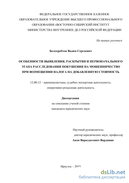 обеспечения деятельности названных подразделений по выявлению, раскрытию и расследованию покушений на мошенничество при возмещении НДС. Положения и выводы диссертационного исследования целесообразно использовать для подготовки учебной, методической и научной литературы по криминалистике и оперативно-розыскной деятельности, а также в системе профессиональной подготовки и повышения квалификации сотрудников правоохранительных органов.