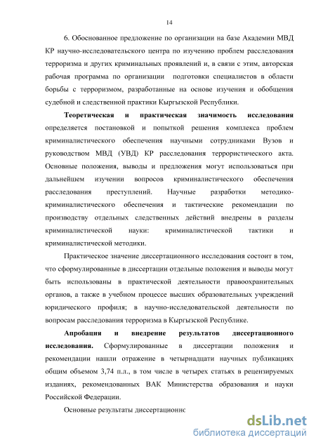 Практическое значение диссертационного исследования состоит в том, что сформулированные в диссертации отдельные положения и выводы могут быть использованы в пpактической деятельности правоохранительных органов, а также в учебном процессе высших образовательных учреждений юридического профиля; в научно-исследовательской деятельности по вопросам расследования терроризма в Кыргызской Республике.