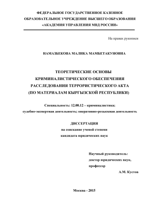 криминалистического обеспечения расследования террористических актов научными сотрудниками Вузов, а также руководством МВД (УВД) КР. Основные положения, выводы и предложения могут использоваться при