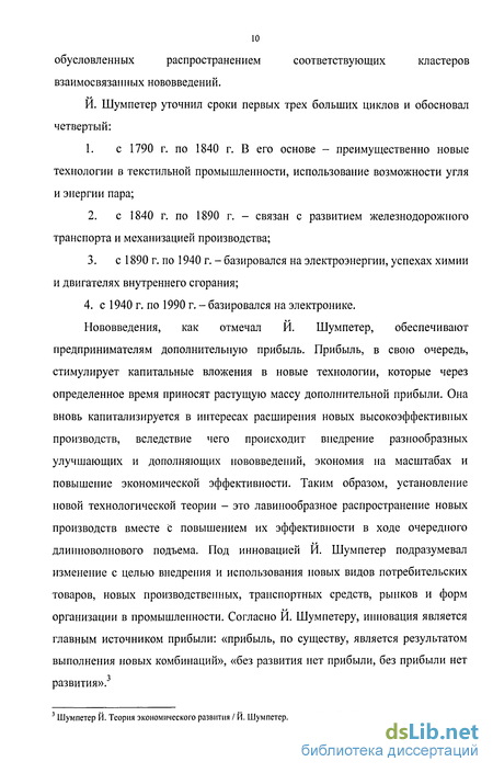 И. Шумпетер широко использовал эволюционный подход, развивая идеи Н. Д. Кондратьева о длительных экономических циклах. Н. Д. Кондратьев одним из первых экономистов предложил историческую периодизацию экономической жизни по длинным волнам (циклам) продолжительностью примерно в пятьдесят лет. Границей больших циклов становятся стыки исчерпания дееспособности старых капитальных благ и начало строительства и функционирования новых средств производства, способных действовать на принципиально новой технико-технологической и организационно-структурной основе, создавая принципиально новые блага длительного пользования.