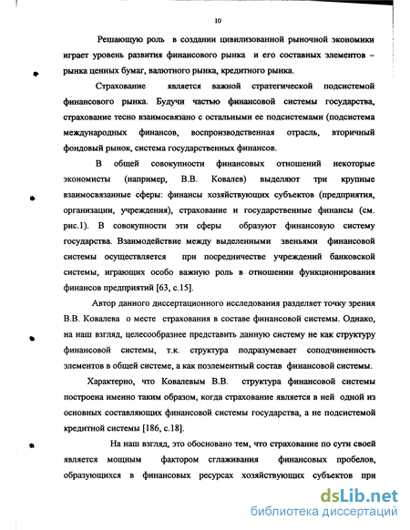 Автор данного диссертационного исследования разделяет точку зрения В.В. Ковалева о месте страхования в составе финансовой системы. Однако, на наш взгляд, целесообразнее представить данную систему не как структуру финансовой системы, т.к. структура подразумевает соподчиненность элементов в общей системе, а как поэлементный состав финансовой системы. Характерно, что Ковалевым В.В. структура финансовой системы построена именно таким образом, когда страхование является в ней одной из основных составляющих финансовой системы государства, а не подсистемой кредитной системы [186, с. 18].