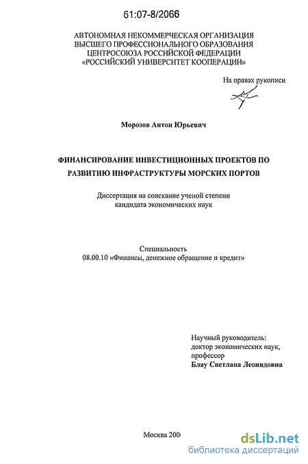 Актуальность темы диссертации обусловлена объективной необходимостью научного исследования вопросов финансирования инвестиционных проектов по развитию инфраструктуры морских портов.