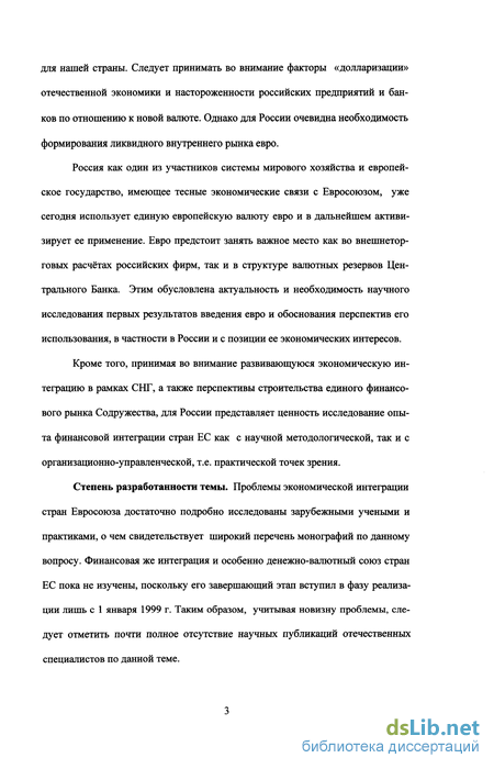 Степень разработанности темы. Проблемы экономической интеграции стран Евросоюза достаточно подробно исследованы зарубежными учеными и практиками, о чем свидетельствует широкий перечень монографий по данному вопросу. Финансовая же интеграция и особенно денежно-валютный союз стран ЕС пока не изучены, поскольку его завершающий этап вступил в фазу реализации лишь с 1 января 1999 г. Таким образом, учитывая новизну проблемы, следует отметить почти полное отсутствие научных публикаций отечественных специалистов по данной теме.