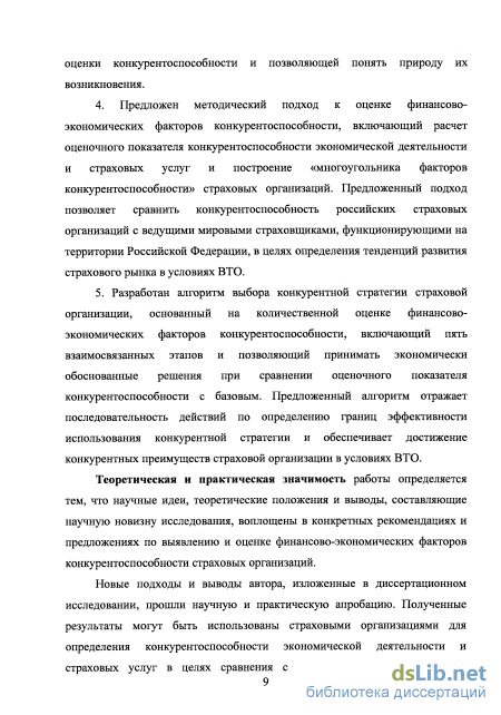 Научная новизна диссертационного исследования состоит в обосновании и оценке финансово-экономических факторов конкурентоспособности, целенаправленное воздействие на которые позволит обеспечить конкурентные преимущества российских страховых организаций в условиях ВТО.