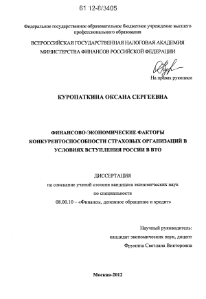 Цель диссертационного исследования состоит в выявлении ключевых финансово-экономических факторов конкурентоспособности страховых организаций и разработке на их основе методических рекомендаций по повышению конкурентных преимуществ российских страховщиков в условиях вступления в ВТО.