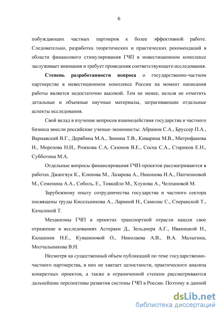 Степень разработанности вопроса. Значительный вклад в изучение вопросов взаимодействия государства и частного сектора внесли следующие российские ученые-экономисты: Абрамов С.А., Бруссер П.А., Варнавский В.Г., Дерябина М.А., Зимина Т.В., Киварина М.В., Митрофанова И.В., Морозова Н.И., Рожкова С.А., Сазонов В.Е., Сосна C.А., Стариков Е.Н., Субботина М.А.