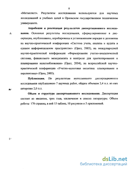 Апробация и реализация результатов диссертационного исследования. Основные результаты исследования, сформулированные в диссертации, опубликованы, апробированы в установленном порядке и доложены на научно-практической конференции «Система учета, анализа и аудита в едином информационном пространстве» (Орел, 2003), на международной научно-практической конференции «Формирование учетно-аналитической системы, финансового менеджмента и контроля для прогнозирования и планирования налогообложения» (Орел, 2004), на всероссийской научно-практической конференции «Учетно-налоговая политика: планирование и перспективы» (Орел, 2005).