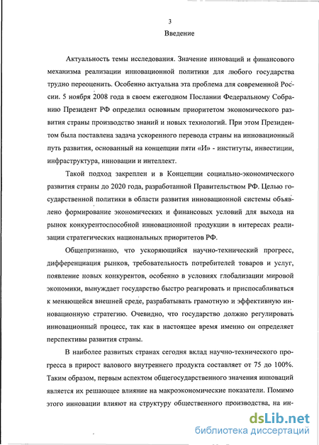 Актуальность темы исследования. Значение инноваций и финансового механизма реализации инновационной политики для любого государства трудно переоценить. Особенно актуальна эта проблема для современной России. 5 ноября 2008 года в своем ежегодном Послании Федеральному Собранию Президент РФ определил основным приоритетом экономического развития страны производство знаний и новых технологий. При этом Президентом была поставлена задача ускоренного перевода страны на инновационный путь развития, основанный на концепции пяти "И" - институты, инвестиции, инфраструктура, инновации и интеллект.