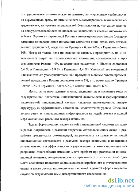 Задача формирования национальной инновационной системы актуализировала потребность в развитии теоретико-методологических основ и разработке практических рекомендаций, направленных на развитие активной инновационной деятельности в реальном секторе экономики и повышение результативности и эффективности осуществляемых в этом направлении мероприятий. Многообразие имеющих место проблем при реализации инновационной политики, неоднозначность их практического решения, необходимость обобщения постоянно обогащающегося зарубежного и отечественного опыта, а также оценки законодательных новаций в данной сфере свидетельствуют об актуальности темы диссертационного исследования.