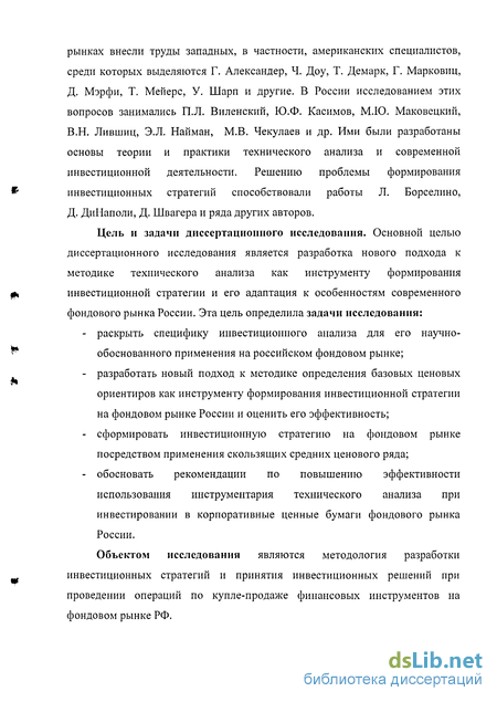 Цель и задачи диссертационного исследования. Основной целью диссертационного исследования является разработка нового подхода к методике технического анализа как инструменту формирования инвестиционной стратегии и его адаптация к особенностям современного фондового рынка России. Эта цель определила задачи исследования: