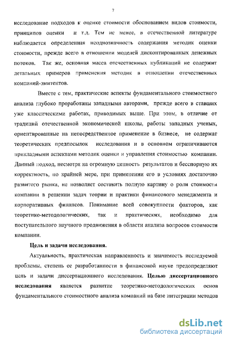 Актуальность, практическая направленность и значимость исследуемой проблемы, степень ее разработанности в финансовой науке предопределяют цель и задачи диссертационного исследования. Целью диссертационного исследования является развитие теоретико-методологических основ фундаментального стоимостного анализа компаний на базе интеграции методов