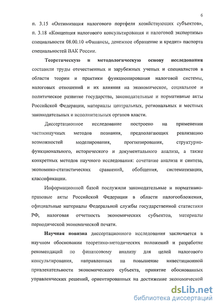 Цель и задачи исследования. Целью диссертационной работы является разработка теоретико-методических положений и практических рекомендаций по реализации инструментов финансового анализа для целей налогового консультирования, направленных на повышение инвестиционной привлекательности экономического субъекта и оптимизации налоговых обязательств. Достижению поставленной цели будет способствовать решение следующих комплексных задач: