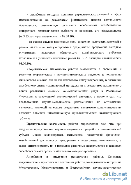 Теоретическая значимость работы заключается в обобщении и развитии теоретических и научно-методических подходов к построению финансового анализа для целей налогового консультирования, в адаптации зарубежного опыта, традиционной методологии и результатов накопленного опыта реализации системы консультационных услуг в Российской Федерации к современной экономической ситуации, а также в том, что предложенные научно-методические рекомендации по оптимизации налоговых платежей на основе результатов налогового консультирования позволят повысить инвестиционную привлекательность хозяйствующего субъекта.