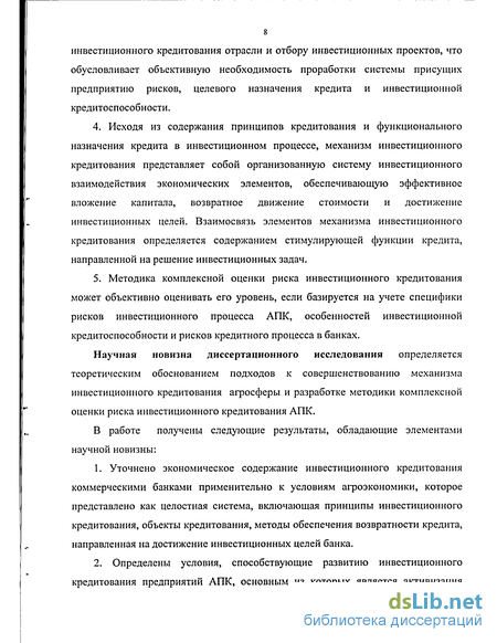 Научная новизна диссертационного исследования определяется теоретическим обоснованием подходов к совершенствованию механизма инвестиционного кредитования агросферы и разработке методики комплексной оценки риска инвестиционного кредитования АПК.