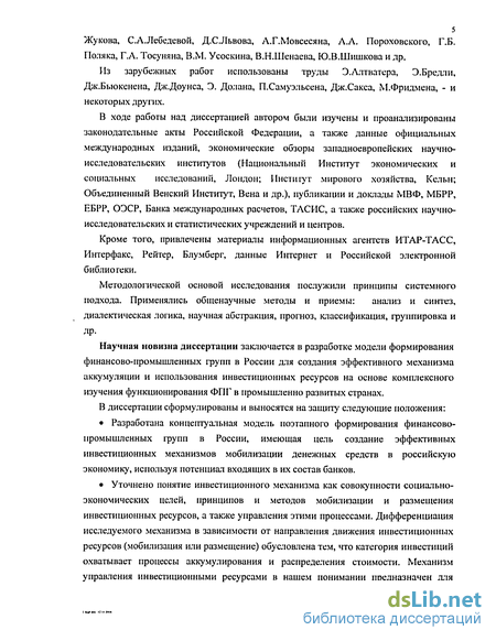 Научная новизна диссертации заключается в разработке модели формирования финансово-промышленных групп в России для создания эффективного механизма аккумуляции и использования инвестиционных ресурсов на основе комплексного изучения функционирования ФПГ в иромышленно развитых странах.