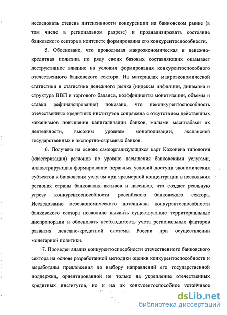 7. Проведен анализ конкурентоспособности отечественного банковского сектора на основе разработанной методики оценки конкурентоспособности и выработаны предложения по выбору направлений его государственной поддержки, ориентированной не только на укрепление отечественных кредитных институтов, но и на их конкурентоспособное устойчивое развитие. Они включают совершенствование системы рефинансирования отечественных банков, применение инструментов секьюритизации кредитных активов для более полного использования потенциала инвестиционно-ориентированной кредитной эмиссии и удовлетворения спроса на средне- и долгосрочные кредитные ресурсы со стороны экономических субъектов. Предложены механизмы повышения капитализации банковского сектора, меры по снижению отдельных требований в части обязательных нормативов и формирования резервов, а также обоснована необходимость внедрения в деятельность отечественных банков норм международной практики по расчету и управлению рисками.