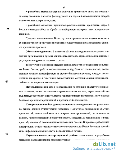 Предмет исследования. В диссертации предметом исследования является оценка уровня кредитных рисков; при осуществлении коммерческими банками кредитного процесса.