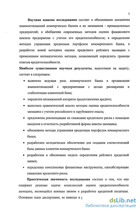 7 Научная новизна исследования состоит в обосновании механизма взаимоотношений коммерческих банков и их заемщиков - промышленных предприятий; в обобщении современных методов оценки финансового анализа предприятия с учетом его кредитоспособности; в определении методов управления кредитным портфелем коммерческого банка, в разработке новой методики оценки кредитного рейтинга заемщика с применением математических методов, позволяющей определить границы классов кредитоспособности.