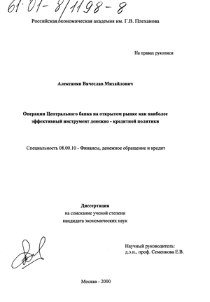 Р.Л., Шарпа У.Ф. Не менее детально рассматриваются проблемы развития современного рынка ценных бумаг и его регулирования государством. В отечественной экономической науке существует много работ, посвященных анализу этих проблем. Фундаментальными методологическими исследованиями рынка ценных бумаг являются работы Алексеева М.Ю., Берзона Н.И., Галанова В.А., Гусевой И.А., Жукова Е.Ф., Миркина Я.М., Мусатова В.Т. По вопросам регулирования рынка ценных бумаг и проведения операций на нем проводились исследования Алексеевым В.В., Голдой З.К, Корищенко К.Н, Козловым А.А., Рубцовым Б.Б., Семенковой Е.В., Фельдманом А.Б. Несмотря на большое количество работ по этим проблемам в экономической литературе недостаточно разработаны вопросы комплексного анализа эффективности использования операций на открытом рынке. Между тем, понимание условий использования данных операций очень важно сегодня для принятия решений, качественно улучшающих состояние банковской системы и денежного обращения страны. Затруднения в проведении исследования связаны с тем, что на российском финансовом рынке за период его существования практически отсутствовали периоды продолжительной стабильности. В своей работе диссертант учитывал результаты имеющихся исследований данного вопроса и особенности российского финансового рынка с учетом его текущего состояния. На основе этого была предпринята попытка анализа операций центрального банка на открытом рынке как наиболее эффективного инструмента денежно - кредитной политики.