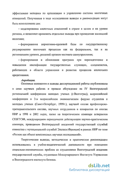 в семи научных работах и прошли обсуждение на IV Волгоградской региональной конференции молодых ученых (г.Волгоград), всероссийской конференции и 2-м всероссийском экономическом форуме студентов и молодых ученых (Санкт-Петербург, 1999г.), научной сессии профессорско-преподавательского состава, научных сотрудников и аспирантов по итогам НИР в 1998 и 2002 годах, также на теоретическом семинаре аспирантов СПбГУЭФ, международном периодически действующем научно-практическом семинаре, проводимом Волгоградской академией государственной службой совместно с муниципальной службой Эльзаса (Франция) в рамках НИР по теме «Регион как объект комплексных научных исследований».