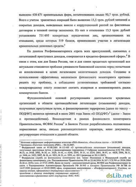 Фундаментальной основой регулирования деятельности кредитных организаций в области противодействия легализации (отмыванию) доходов, полученных преступным путем, и финансированию терроризма (далее по тексту -ПОД/ФТ) является принятый в июле 2001 года Закон «О ПОД/ФТ»5 (далее - Закон о противодействии). Впоследствии в рамках финансового мониторинга Правительством, ФСФМ России6 и Банком России разрабатывались подзаконные нормативные акты, письма рекомендательного характера, иные документы, регулирующие отношения в данной области.