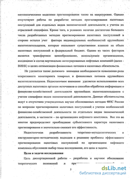 Цель диссертационной работы - разработка и научное обоснование теоретических положений и практических рекомендаций по совершенствованию налогового прогнозирования в отношении крупнейших налогоплательщиков; входящих в состав ВИНЕ.