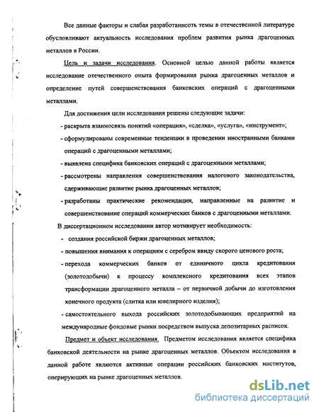 Цель и задачи исследования. Основной целью данной работы является исследование отечественного опыта формирования рынка драгоценных металлов и определение путей совершенствования банковских операций с драгоценными металлами.