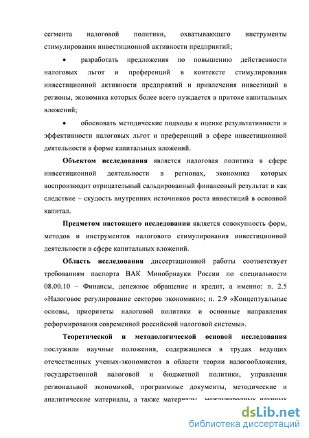 Объектом исследования является налоговая политика в сфере инвестиционной деятельности в регионах, экономика которых воспроизводит отрицательный сальдированный финансовый результат и как следствие - скудость внутренних источников роста инвестиций в основной капитал.