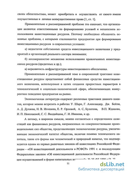 раскрыто экономическое содержание инвестиционных ресурсов предприятия применительно к современным условиям хозяйствования, которые предлагается рассматривать как финансовые средства хозяйствующих субъектов, привлекаемые из различных финансовых источников для производства товаров и услуг, воспроизводства основных фондов, совершенствования технологической базы, профессиональной подготовки и переподготовки кадров (с. 12— 22);