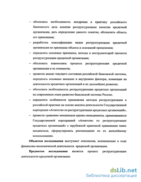 - проанализировать теоретические подходы к понятию реструктуризация кредитных организаций, применяемые в России, определить их обоснованность и правомерность, осуществить сравнение с понятием реструктуризация, используемым в зарубежной практике;