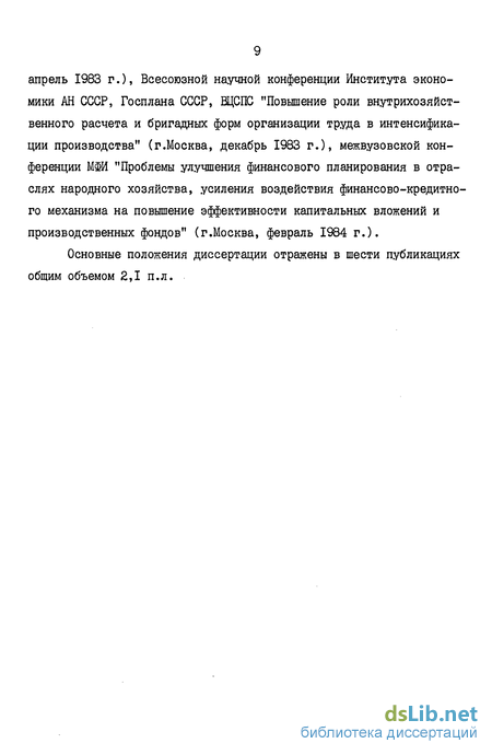 апрель 1983 г.), Всесоюзной научной конференции Института экономики АН СССР, Госплана СССР, ВЦСПС "Повышение роли внутрихозяйственного расчета и бригадных форм организации труда в интенсификации производства" (г.Москва, декабрь 1983 г.), межвузовской конференции МШИ "Проблемы улучшения финансового планирования в отраслях народного хозяйства, усиления воздействия финансово-кредитного механизма на повышение эффективности капитальных вложений и производственных фондов" (г.Москва, февраль 1984 г.).