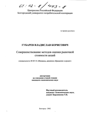 Апробация и внедрение результатов исследования. Содержащиеся в диссертации выводы и предложения по механизму оценки рыночной стоимости акций внедрены в практику ОАО "Конпрок" (справка от 27.03.2001 г.), филиала АКБ "Внешторгбанка" г. Белгорода (справка от 28.02.2001 г.), филиала АКБ "Московского индустриального банка" г. Белгорода (справка от 05.03.2001 г.).