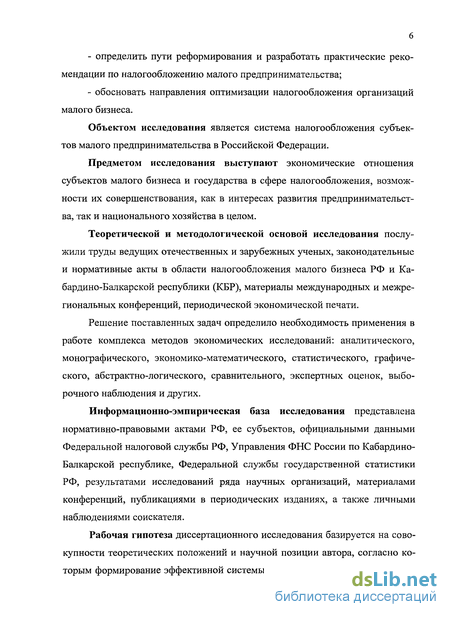 Цель и задачи исследования. Целью диссертационного исследования является обоснование теоретических основ и разработка практических рекомендаций по совершенствованию системы налогообложения малого бизнеса, направленных на его поддержку.