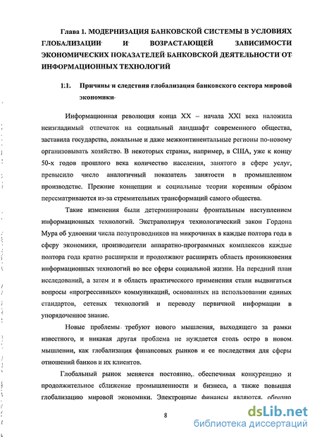 Глава 1. МОДЕРНИЗАЦИЯ БАНКОВСКОЙ СИСТЕМЫ В УСЛОВИЯХ ГЛОБАЛИЗАЦИИ И ВОЗРАСТАЮЩЕЙ ЗАВИСИМОСТИ ЭКОНОМИЧЕСКИХ ПОКАЗАТЕЛЕЙ БАНКОВСКОЙ ДЕЯТЕЛЬНОСТИ ОТ ИНФОРМАЦИОННЫХ ТЕХНОЛОГИЙ 8