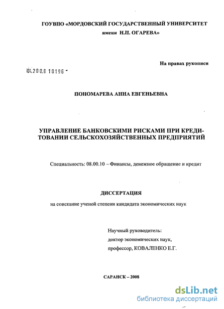 Теория и современная практика банковского дела и кредитования нашла отражение в трудах зарубежных ученых (Э.Д. Долан, К.Д. Кэмпбелл, Р:Д. Кэм-пбелл, П.С. Роуз и др.) и отечественных представителей экономической науки (Е.Ф. Жуков, Г.Г. Коробова, Ю.И. Коробов, О.И. Лаврушин, И.Д. Мамонова и др.). Их исследования создают основу и подтверждают значимость дальнейших разработок вопросов теоретического представления о банковской деятельности, ее условиях, технологии и эффективности. Фундаментальными исследованиями кредитования коммерческих банков являются труды таких отечественных ученых, как С.Я. Борового, СЕ. Егорова, М.М. Коробейникова, М.Л. Лишанского, М.Ю. Матовникова, М.Н.Тоцкого. Практическим и методическим вопросам кредитной политики коммерческого банка посвящены труды зарубежных ученых Э. Гилла, Р.К. Гросиана, Р. Кот-тера, М. Матука, Дж. Полфремана, Ж. Ривуара, Э Рида, Э. Роде и др. В них содержатся теоретические положения по кредитной системе и ее элементам, а также развитие методов оценки кредитоспособности заемщиков. Однако, несмотря на наличие широкого спектра'научных работ по рассматриваемому направлению, остаются недостаточно исследованными вопросы кредитования таких заемщиков как сельскохозяйственные товаропроизводители. Несмотря на то, что проблемам теории и практики управления банковскими рисками в последние годы уделяется немало внимания (например, в трудах Н.И. Валенцевой, А.Г. Ивасенко, С.Н. Кабушкина, О.И. Лаврушина, В.Т. Севрук, Н.Э. Соколинской, А.А. Хандруева и др.) целый ряд вопросов остаются дискуссионными и требуют дальнейшего научного исследования. К числу таких вопросов относится обоснование специфических особенностей управления кредитными рисками.