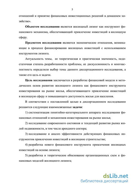 Цель исследования заключается в разработке финансовой модели и методических основ развития жилищного лизинга как финансового инструмента инвестирования на рынке жилья, обеспечивающего привлечение инвестиций в жилищную сферу и повышающего доступность жилья для населения.