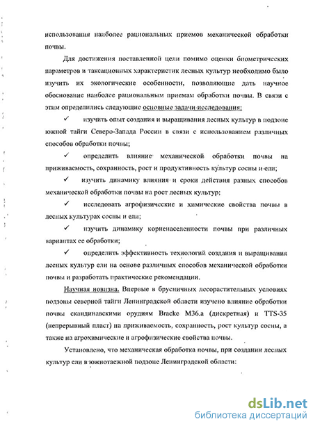 Научные положения, составляющие предмет защиты: 1. Влияние механической обработки почвы скандинавскими почвообрабатывающим орудиям Bracke МЗб.а и TTS-35 на приживаемость и рост культур сосны, агрохимические и агрофизические свойства почвы в брусничных лесорастительных условиях южнотаежной подзоны Ленинградской области;
